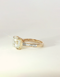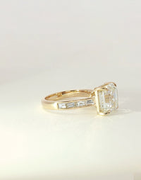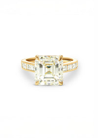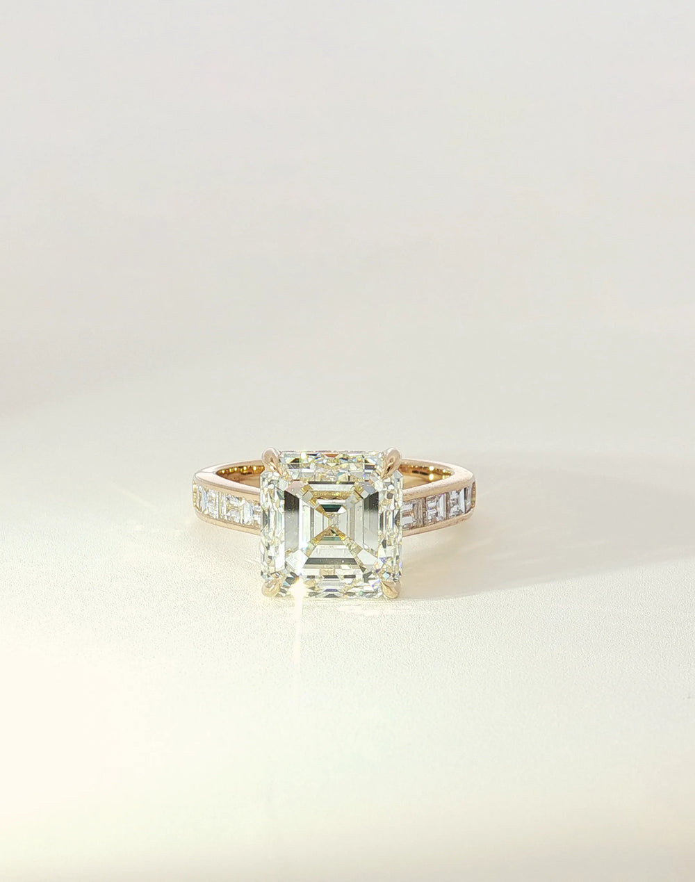 Asscher: This premium piece features a stunning 5.52-carat Asscher-cut natural diamond, graded M color and SI1 clarity, set in four elegant claw prongs. Crafted in substantial 18K yellow gold, the design showcases bold geometry and timeless sophistication. The center stone is flanked by eight east-west channel-set baguette diamonds, adding clean, architectural lines. What truly sets this ring apart are the signature diamond ‘T’ motifs on each side—an exclusive TaTe design element that adds our distinctive touch. With a total diamond weight of 6.50 carats and a significant gold presence, this ring not only looks luxurious—it feels it. A true statement of craftsmanship, character, and style.
