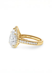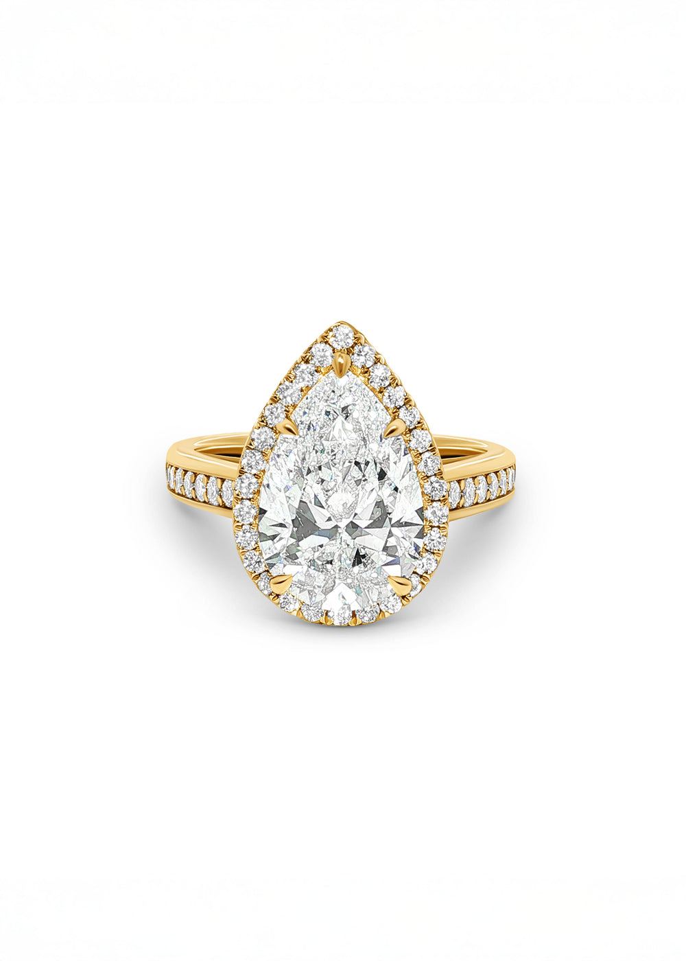 A rare 3.37-carat pear-shaped diamond (D/Internally Flawless) in 18K yellow gold, secured in refined claw prongs to keep the silhouette clean and luminous. A pavé halo and diamond-set shoulders complete the line. Total diamond weight: 3.86 ct.