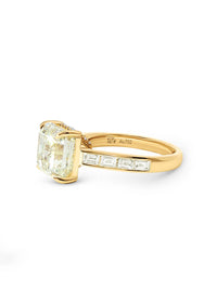 A 6.02-carat Asscher-cut natural diamond (M/SI1) set in 18K yellow gold, framed by channel-set baguettes for crisp, architectural sparkle. Finished with TaTe’s signature diamond “T” motifs. Total diamond weight: 6.50 ct.
