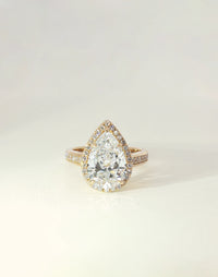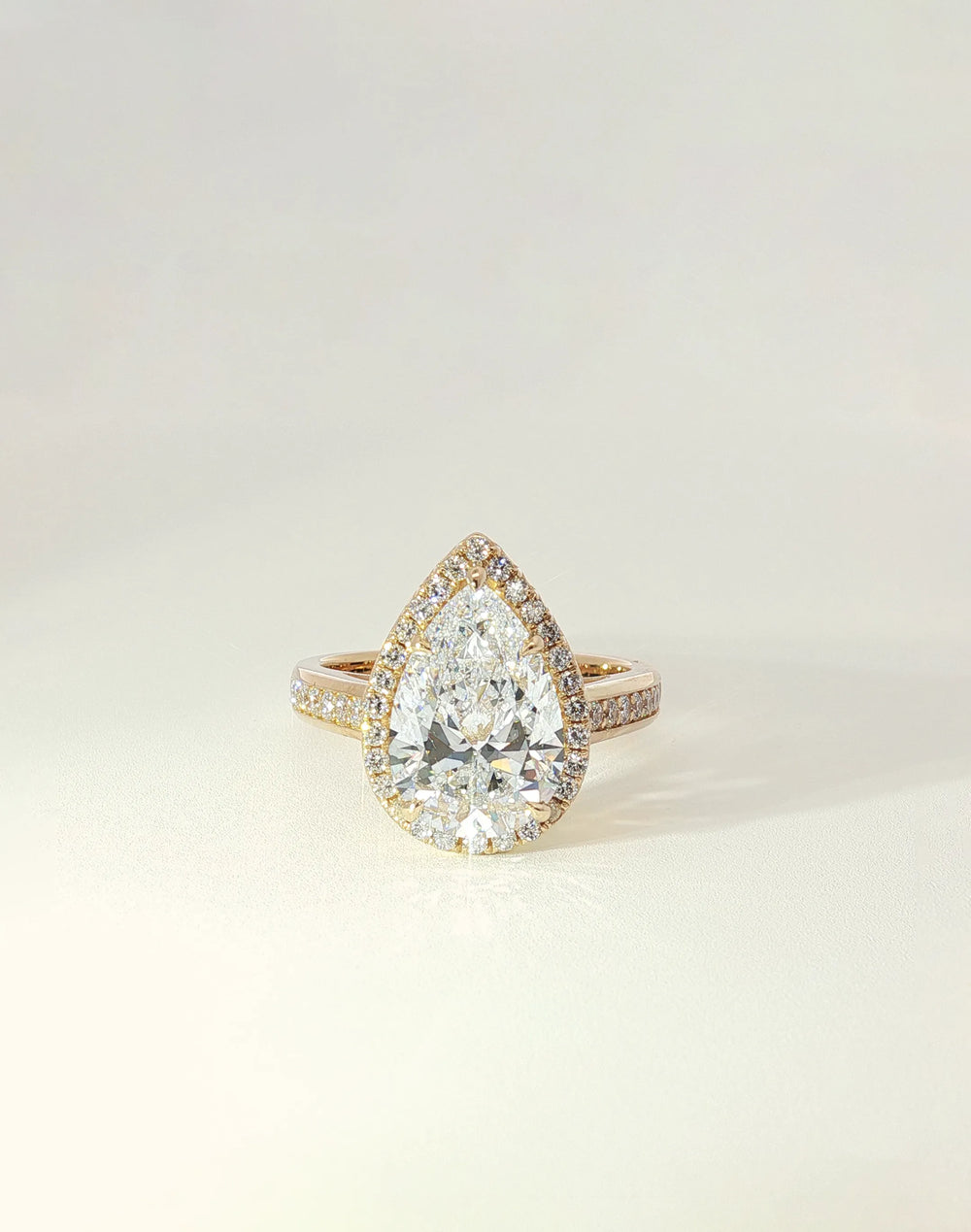 This solid 18-karat yellow gold ring centers a remarkably rare 3.37-carat pear-shaped brilliant diamond, graded D color and Internally Flawless. An investment-grade jewel, this diamond’s exceptional size, purity, and color make it truly one-of-a-kind. Secured by five refined claw prongs, the center stone is showcased to maximize light performance, creating a clean and elegant silhouette. Surrounding the pear-shaped diamond is a delicate pavé halo of round diamonds, complemented by bead-set diamond shoulders, reflecting thoughtful design and timeless sophistication. With a total carat weight of 3.86, this ring achieves a masterful balance of bold yet graceful. A true collector’s piece, it stands as a testament to rarity, refinement, impeccable craftsmanship, and an unwavering eye for perfection