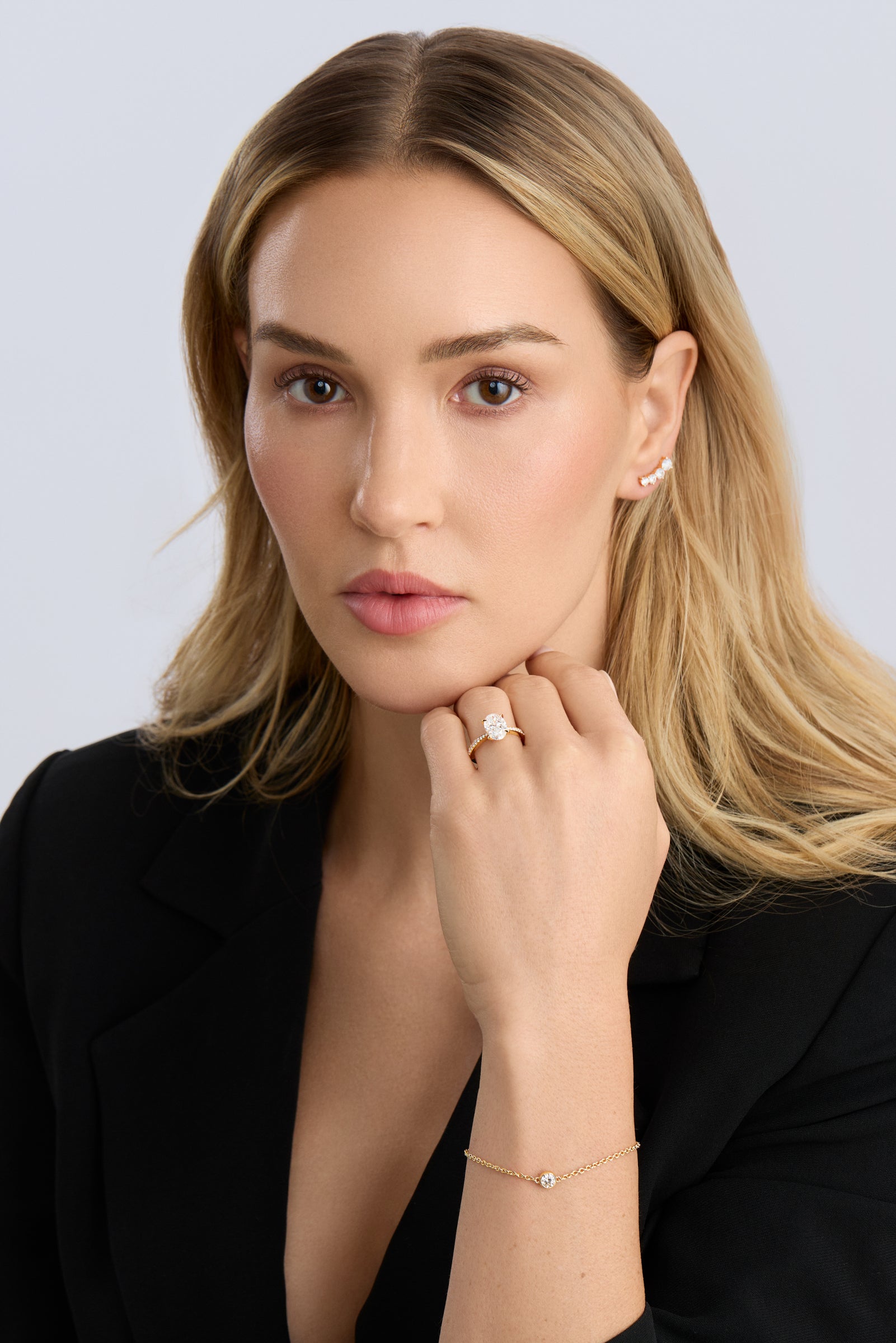 A 2.35 ct elongated oval diamond is set in 18K yellow gold, lifted by a cathedral shank that frames the center stone. Twenty round brilliant diamonds — ten on each side — taper along the band, adding a flowing line of light to the warmth of the gold.